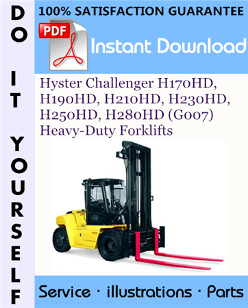 This is the COMPLETE Parts Manual for the Hyster Challenger H170HD, H190HD, H210HD, H230HD, H250HD, H280HD (G007) Heavy-Duty Forklifts. This manual contains all the information you need to properly replace parts on your Hyster Challenger H170HD, H190HD, H210HD, H230HD, H250HD, H280HD (G007) Heavy-Duty Forklifts. Filled with illustrations and all part numbers. with step-by-step instruction & highly detailed exploded pictures & diagrams to show you how to complete the required job correctly & efficiently. It’s the same type of Manual that your local Dealer/Mechanic would use.